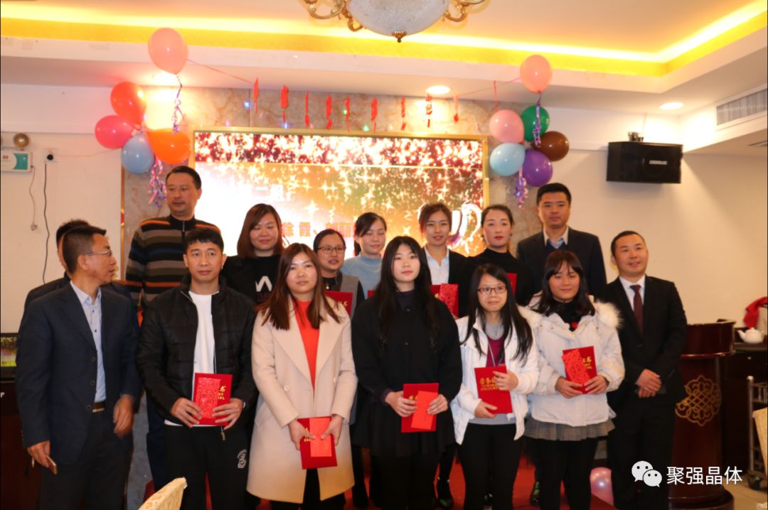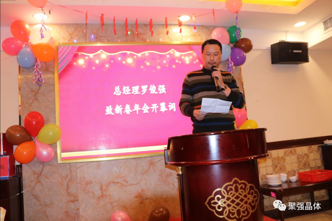2018年2月1日18时30分,为展现聚强晶体有限公司日新月异、澎湃发展的良好风貌,增进友谊、增强凝聚力,为表达公司对全体职工节日的关怀与问候、表彰一批业绩优秀的职员和员工、营造节日活跃的气氛、增进大家的沟通和交流,答谢大家一年来辛勤的工作与默默付出,聚强晶体2018新春感恩年会暨2017年度优秀员工表彰晚会在深圳市光明新区田寮国际大酒店隆重举行。